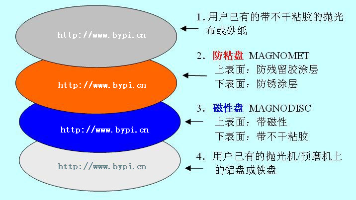 3. 利用用户现使用的抛光布或砂纸带下表面的不干粘胶,将抛光布或砂纸粘接在防粘盘(MAGNOMET)的上表面(该面光滑,带防残留胶涂层,不光滑的另一面与磁性盘接触);