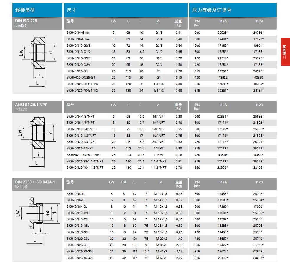德国高压球阀已有超过六十年的历史。产品主要包括高压球阀和针形调节阀两个系列。目前能提供压力最高达150MPa,温度从-196℃到500℃的高压球阀。美尔基安球阀以其独到的密封技术,产品可用于甚至是苛刻和剧毒的介质。 美尔基安的高压球阀的客户目前遍布世二通高压球阀:KH-CETOP,BKH-SAEFS,KHZ-SAE公制螺纹BKH-AS,BKH-F,BKH-AS,MKH-